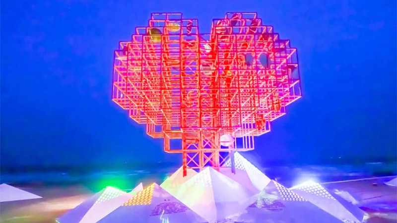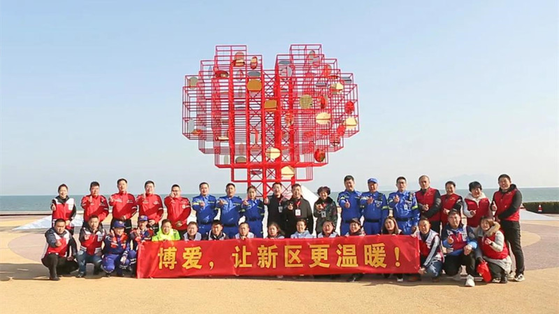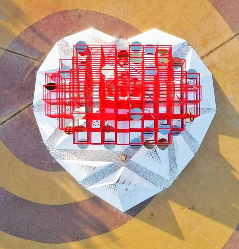 該雕塑位于城市陽臺景區原海螺廣場,距風河入??诒卑都s400米,背靠會展公園,與靈山島隔海相望。采用動態雕塑形式,主體結構為愛心狀,內部由一片片可以風動的鏡面不銹鋼組成,猶如多顆“愛心”爭相簇擁;從空中俯瞰,亦成“心”形,寓意“愛心匯聚”。側面呈紅十字狀,底座呈山形,與風河、大海相呼應,象征“山海情深”。作品整體與環境相融,實現“山海情深、愛心匯聚”的詩意表達,與紅十字“人道、博愛、奉獻”精神完美契合,展現了新區人民熱心公益、崇德向善的社會風尚和勇立潮頭、積極向上的精神風貌。